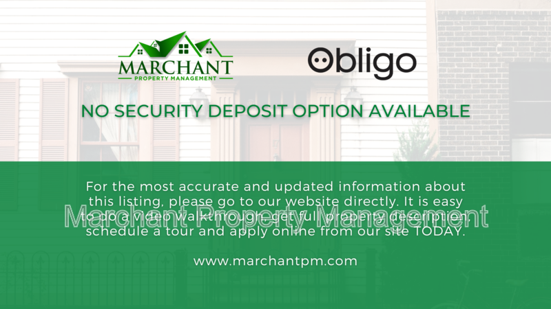 NO SECURITY DEPOSIT OPTION: All of our properties offer a NO SECURITY DEPOSIT OPTION through Obligo. Obligo is a security deposit alternative that replaces the need for a traditional security deposit. Instead of a large upfront cash security deposit, renters pay Obligo a small non-refundable service fee, and Obligo insures each home for the property owner in case of damages and lost rent that might occur. The Obligo enrollment process takes just minutes and is available to all renters, regardless of credit score or income.